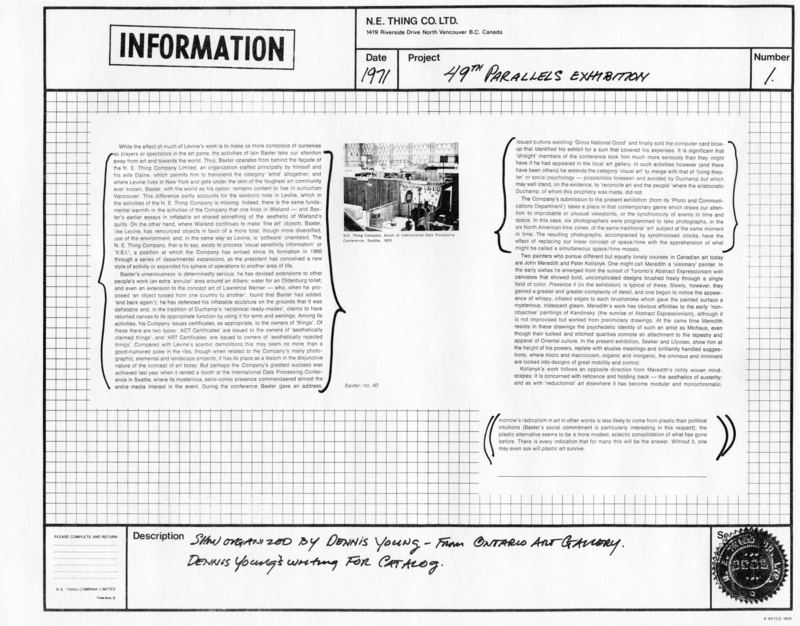 N.E. Thing Co. Ltd., "N.E. Thing Co. Ltd., Vol. 1," in IAINBAXTER&raisonnE, Item #1469, https://collections.uwindsor.ca/iain-baxterand_raisonne/items/show/1469 (accessed February 6, 2026).