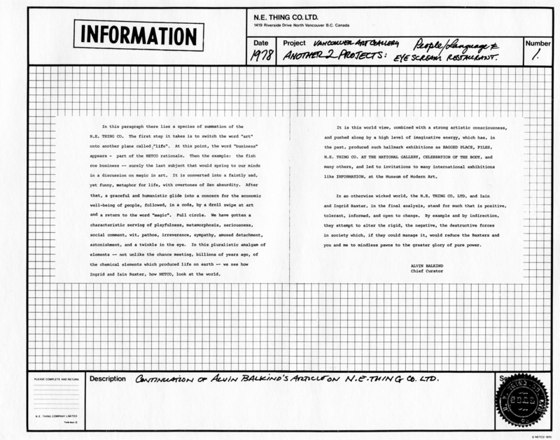 N.E. Thing Co. Ltd., "N.E. Thing Co. Ltd., Vol. 1," in IAINBAXTER&raisonnE, Item #1541, https://collections.uwindsor.ca/iain-baxterand_raisonne/items/show/1541 (accessed February 11, 2026).