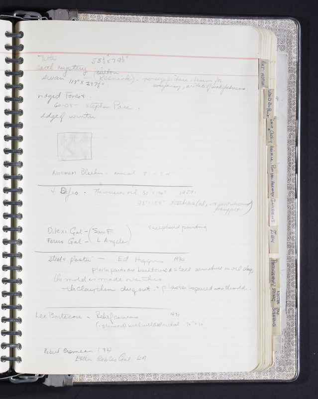 Located in Iain Baxter Fonds, Library & Archives: Box 2, File 14; Hardcover notebook containing notes on 110 pages, including 5 loose pages.