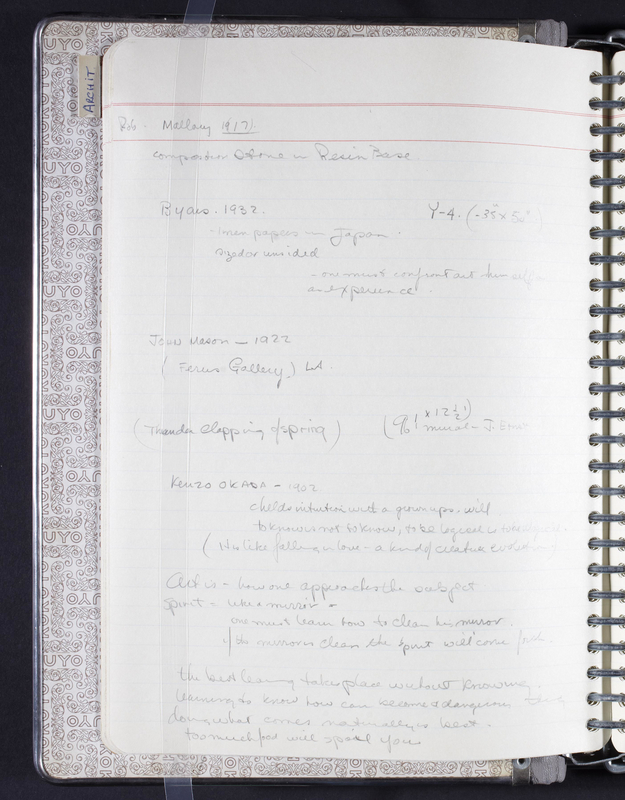 Located in Iain Baxter Fonds, Library & Archives: Box 2, File 14; Hardcover notebook containing notes on 110 pages, including 5 loose pages.