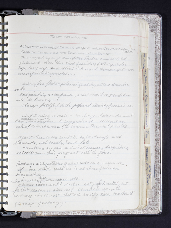 Located in Iain Baxter Fonds, Library & Archives: Box 2, File 14; Hardcover notebook containing notes on 110 pages, including 5 loose pages.