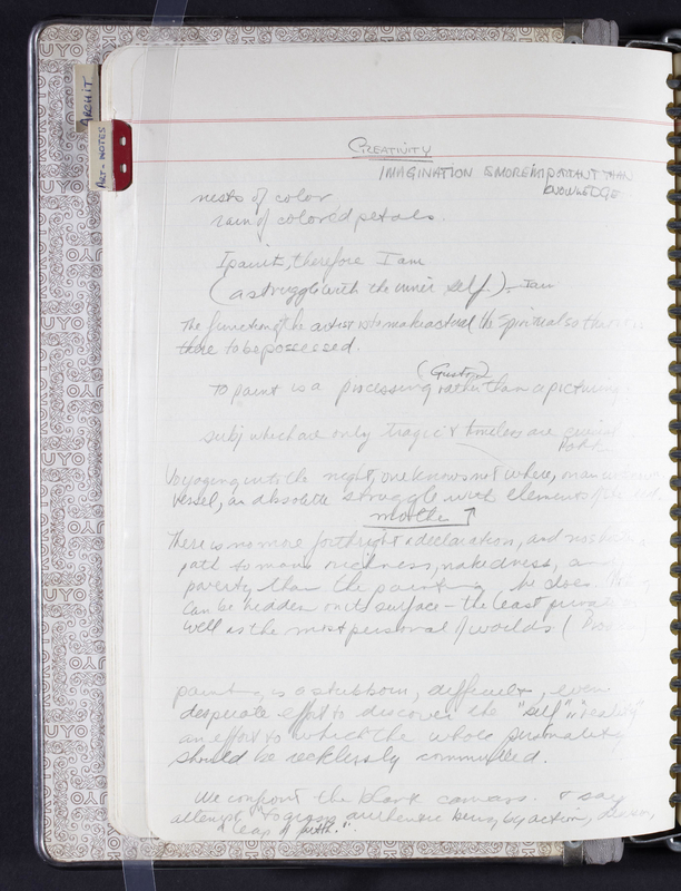 Located in Iain Baxter Fonds, Library & Archives: Box 2, File 14; Hardcover notebook containing notes on 110 pages, including 5 loose pages.