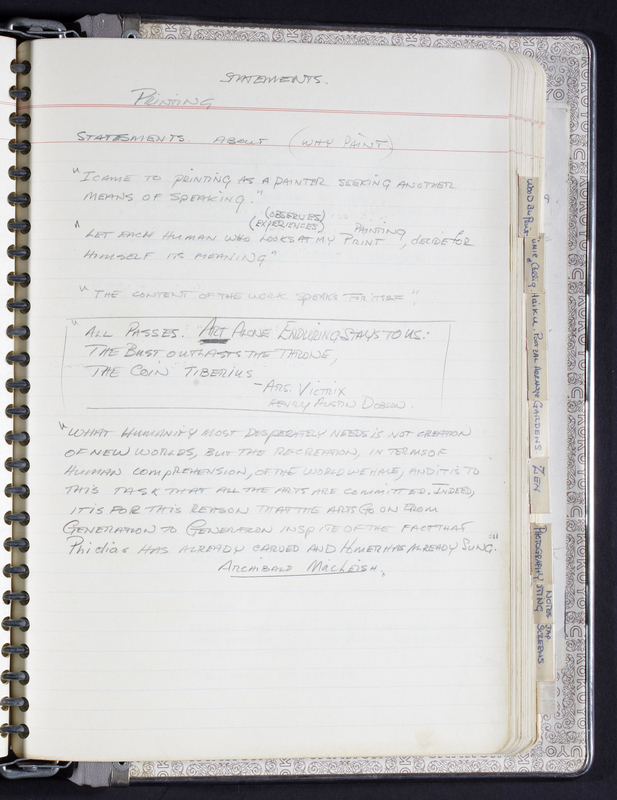 Located in Iain Baxter Fonds, Library & Archives: Box 2, File 14; Hardcover notebook containing notes on 110 pages, including 5 loose pages.