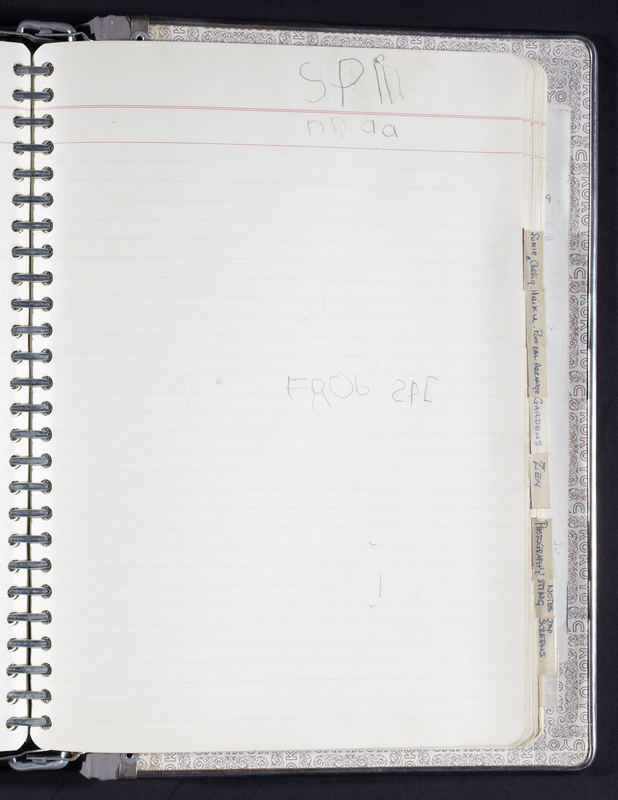 Located in Iain Baxter Fonds, Library & Archives: Box 2, File 14; Hardcover notebook containing notes on 110 pages, including 5 loose pages.