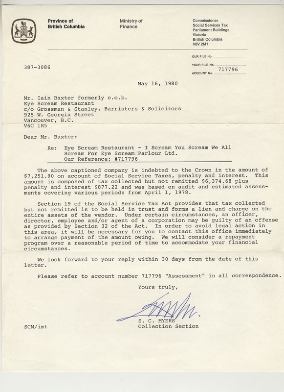 Unidentified, "General correspondence, Eye Scream Restaurant, collection letter, social services tax, Province of British Columbia," in IAINBAXTER&raisonnE, Item #3441, https://collections.uwindsor.ca/iain-baxterand_raisonne/items/show/3441 (accessed January 16, 2026).