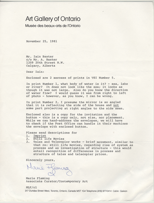 Le Sueur Fleming, Marie, "General correspondence, AGO," in IAINBAXTER&raisonnE, Item #3472, https://collections.uwindsor.ca/iain-baxterand_raisonne/items/show/3472 (accessed January 14, 2026).