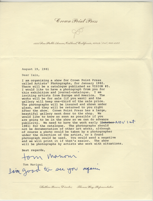 Marioni, Tom, "General correspondence, Crown Point Press," in IAINBAXTER&raisonnE, Item #3474, https://collections.uwindsor.ca/iain-baxterand_raisonne/items/show/3474 (accessed January 14, 2026).