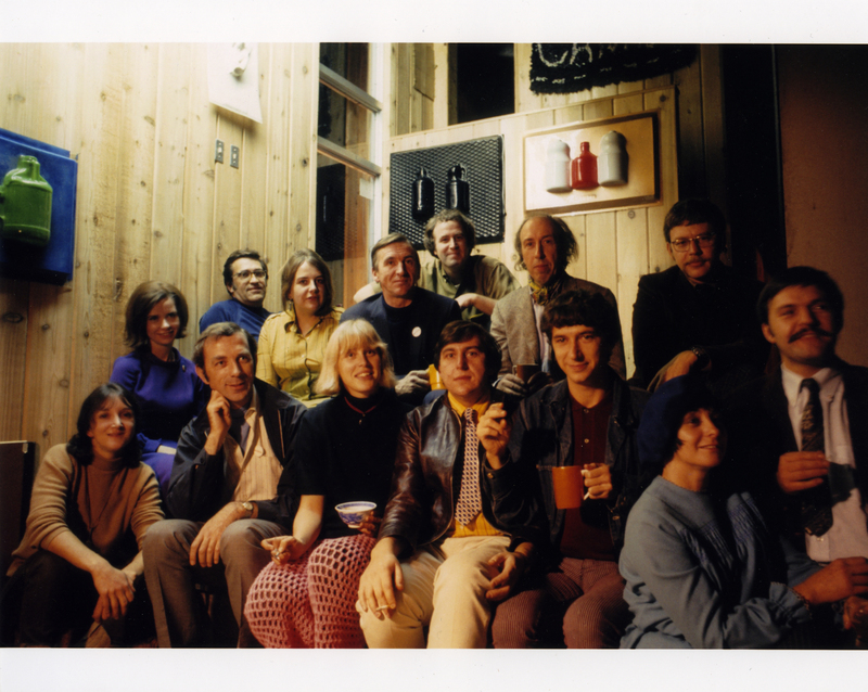 Left to right (front row): Carol Itter, Dennis Young, Ingrid Baxter, Michael Morris, Glenn Lewis, Mrs. Breeze, Claude Breeze; (second row): unknown, unknown, Charlotte Townsend, William Turnbull, IAIN BAXTER&, Richard Hamilton, Brian Fischer