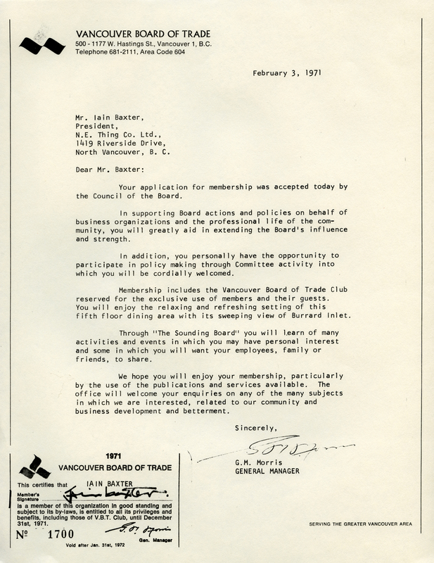 - G.M. Morris (General Manager, Vancouver Board of Trade) to IAIN BAXTER&, 3 February 1971