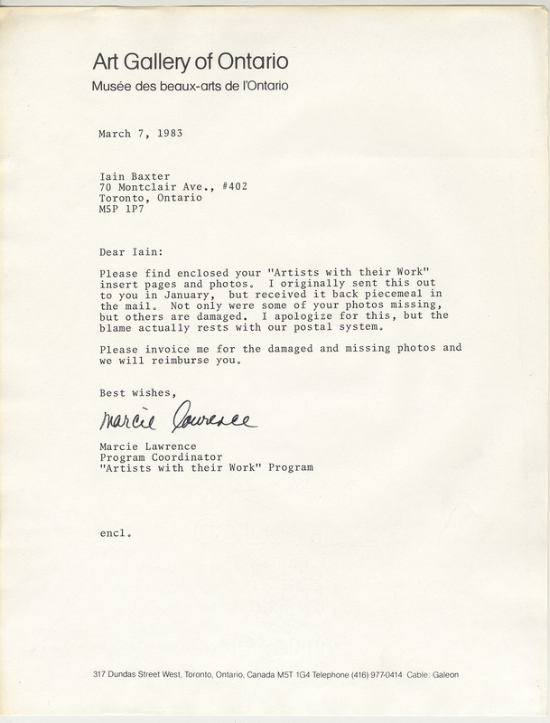 Lawrence, Marcie, "Correspondence, Art Gallery of Ontario, catalogue update," in IAINBAXTER&raisonnE, Item #3964, https://collections.uwindsor.ca/iain-baxterand_raisonne/items/show/3964 (accessed January 12, 2026).