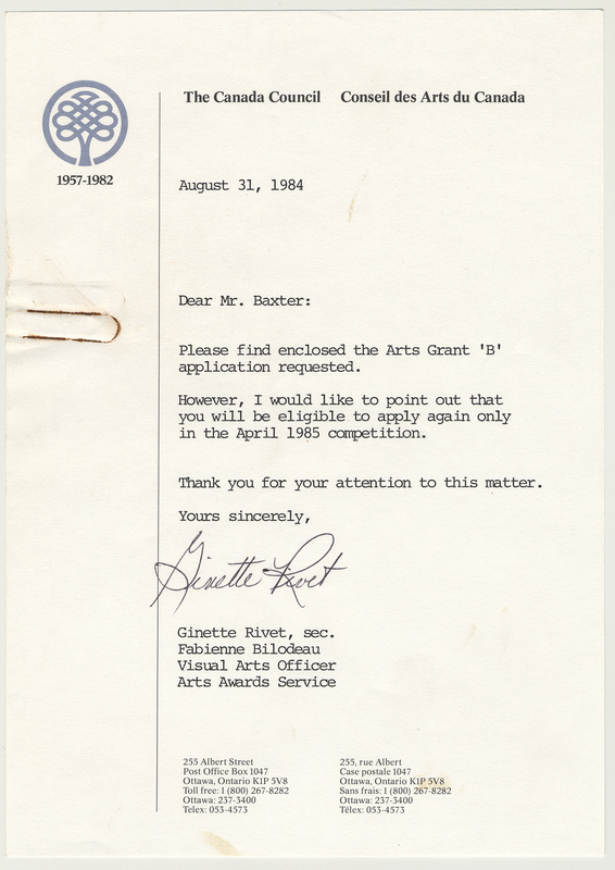 - Correspondence, Canada Council Arts Grant B, letter and application