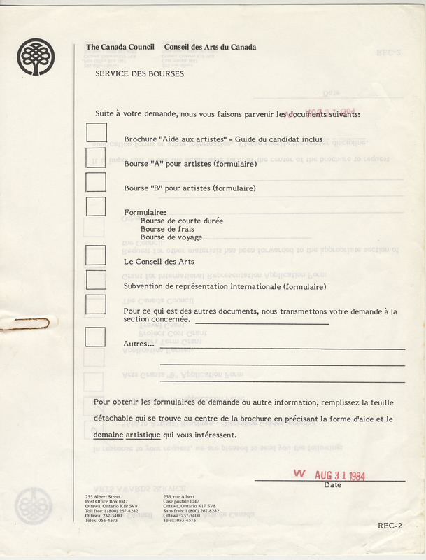 - Correspondence, Canada Council Arts Grant B, letter and application