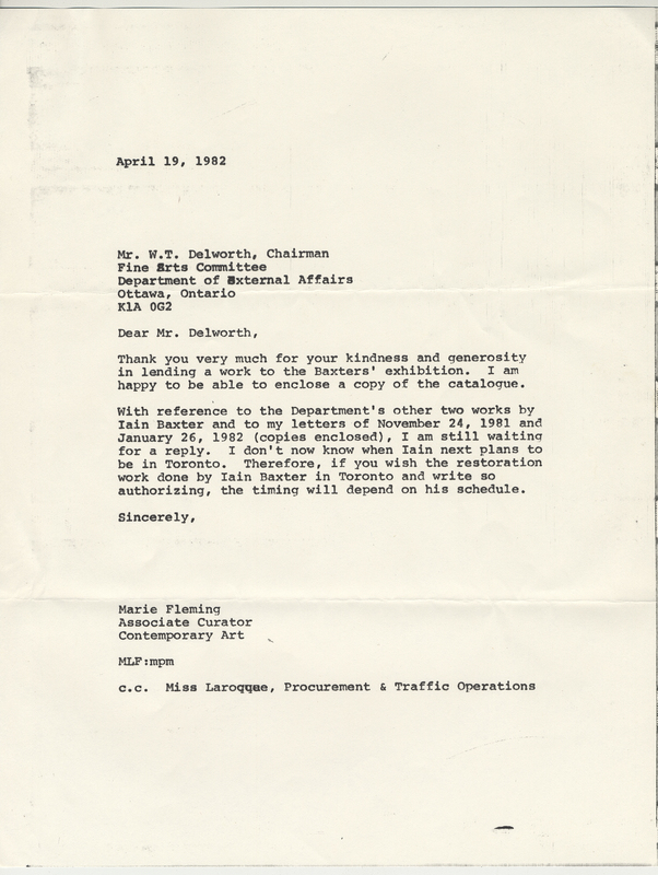Fleming, Marie Le Sueur , "Correspondence, AGO, supporting correspondence with External Affairs," in IAINBAXTER&raisonnE, Item #3975, https://collections.uwindsor.ca/iain-baxterand_raisonne/items/show/3975 (accessed January 12, 2026).