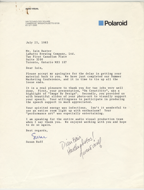 Ruff, Susan, "Correspondence, Polaroid," in IAINBAXTER&raisonnE, Item #3980, https://collections.uwindsor.ca/iain-baxterand_raisonne/items/show/3980 (accessed January 14, 2026).