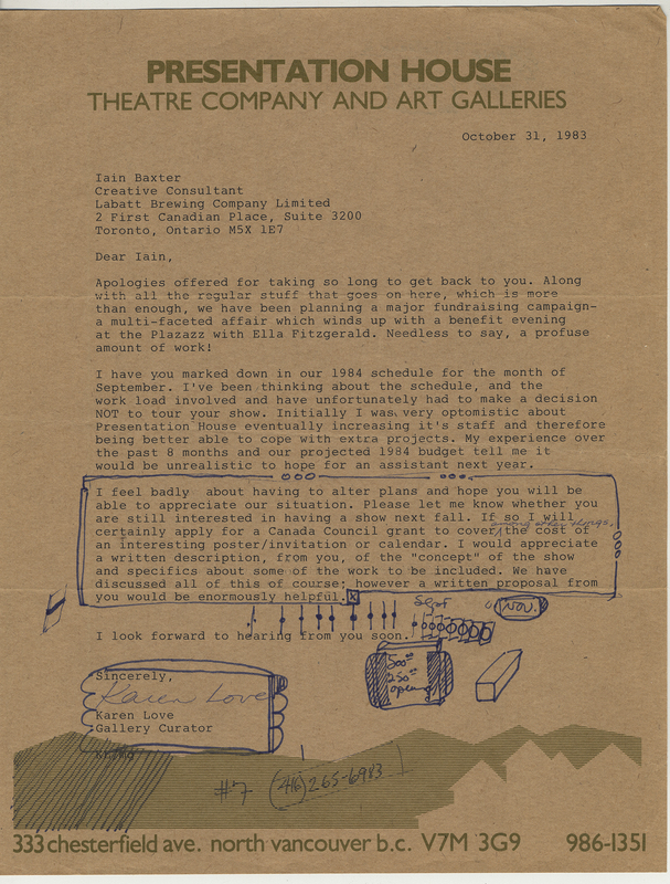 Love, Karen, "Correspondence, Presentation House," in IAINBAXTER&raisonnE, Item #3983, https://collections.uwindsor.ca/iain-baxterand_raisonne/items/show/3983 (accessed January 12, 2026).