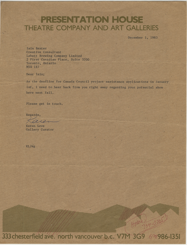 Love, Karen, "Correspondence, Presentation House," in IAINBAXTER&raisonnE, Item #3984, https://collections.uwindsor.ca/iain-baxterand_raisonne/items/show/3984 (accessed February 6, 2026).