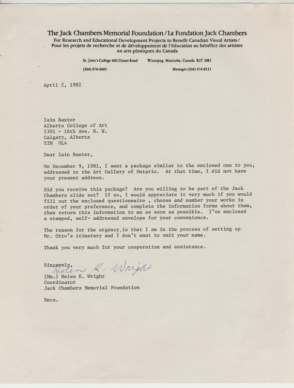 Wright Helen K., "Correspondence, Jack Chambers Memorial Foundation," in IAINBAXTER&raisonnE, Item #3986, https://collections.uwindsor.ca/iain-baxterand_raisonne/items/show/3986 (accessed January 11, 2026).