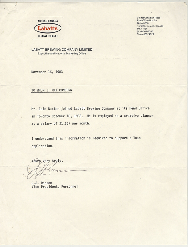 Ranson, Jan, "Labatt's stuff, employment letter," in IAINBAXTER&raisonnE, Item #3998, https://collections.uwindsor.ca/iain-baxterand_raisonne/items/show/3998 (accessed January 12, 2026).