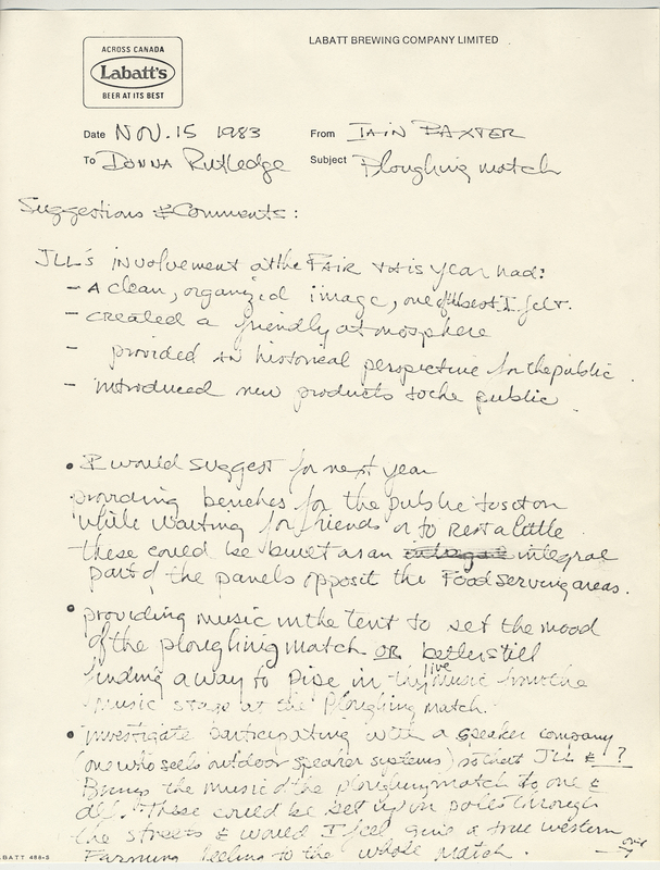 - Labatt's stuff, memo notes and sketch, re. ploughing match [photocopy]