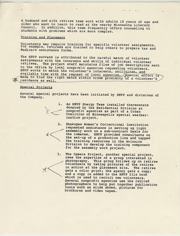 Labatt's stuff, retired employees project outline correspondence and project outline with supporting documentation regarding Honeywell Retiree Volunteer Project [HRVP]