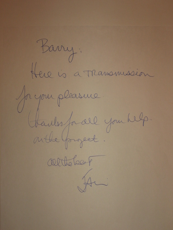 When the show was over Iain said he wanted to give me something as a token of thanks. I said I really liked working on the transmission project so he gave me one of the transmissions. I declared the gift to the AGO and was told it was OK to keep it for myself. Might have had something to do with the imagery." --Barry Simpson