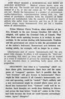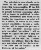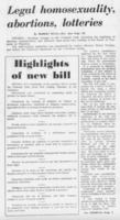 Pat Whealen gives his opinion on the proposed Criminal Code changes. He describes the changes as minor and justified. He says there is a wide belief about the morals of homosexuality, but it is real and homosexual acts do occur. He thinks when these acts are with a child or when coercion is involved, it is a crime, but says that most of these acts are done between two consenting adults.