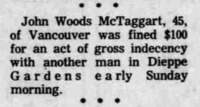 John Woods McTaggart from Vancouver was fined 100 dollars for committing gross indecency with another man in Dieppe Gardens on Sunday morning.