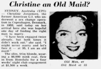 A newspaper article covering the recent sex change surgery of Christine Jorgensen, an actress, and her relationship troubles.
