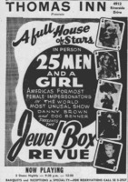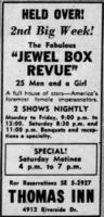 This advertisement announces that the Jewel Box Revue's act at the Thomas Inn has been held over longer than expected and advertises their 2 nightly shows from Monday to Saturday each week.