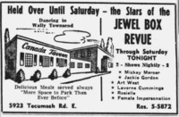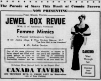 An advertisement highlighting many of the members of Jewel Box Revue by name, including Mr. Jackie Maye and Miss Mickey Mercer., M.C. "The Only Girl in the Company". It features a review for their show, which occurred Wednesdays through to Saturdays at the Canada Tavern.