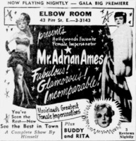 A newspaper advertisement showcasing Adrian Ames presenting at White's Elbow Room nightly in Windsor. The advertisement features two close-up images of Ames, one as a brunette and one as a blonde.