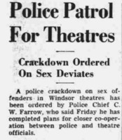 An excerpt of an article titled "Police Patrol For Theatres" from The Windsor Star discussing "sex deviates" meeting in theatres and the city's efforts to stop this behaviour.