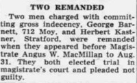 George Barnett from Windsor and Herbert Kastner of Stratford were charged with gross indecency. Both men pleaded not guilty, leading the case to go to trial on 31 August.