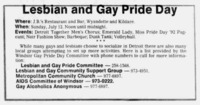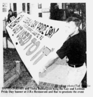 David Jakoby, one of the organizers of Windsor's first ever Lesbian and Gay Pride Day on Sunday. Gives testimonies from local queer people. Also gives the when and where of the day, and events being held such as a barbecue, dunk tank, and Miss Pride Day '92 along with the many support groups that will be there. Includes a picture of the Pride Day sign being held by Jakoby and Tisha Baillargeon in front of J.B's, where it will be held.