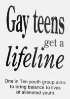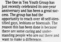 An article discussing a young man and how his parent's helped him to cope with his sexuality in an unaccepting world. The article also gives information on how to contact the 1 in 10 Youth Group.