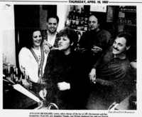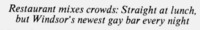 JB's Restaurant and Bar, a new restaraunt in town, has decided to divide themselves into two sections: during the fay a lunch spot, and at night a gay bar. The article also discusses the nearby Happy Tap, another gay bar, managed by Richard Casey. It also tells the story of Jean-Guy Brassard, the owner of JBs, and how he has come to run a gay bar. He defines himself as straight but "gay positive".