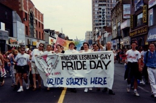 Windsor Pride parade marchers and banner from the fourth Pride Parade (9 July 1995)