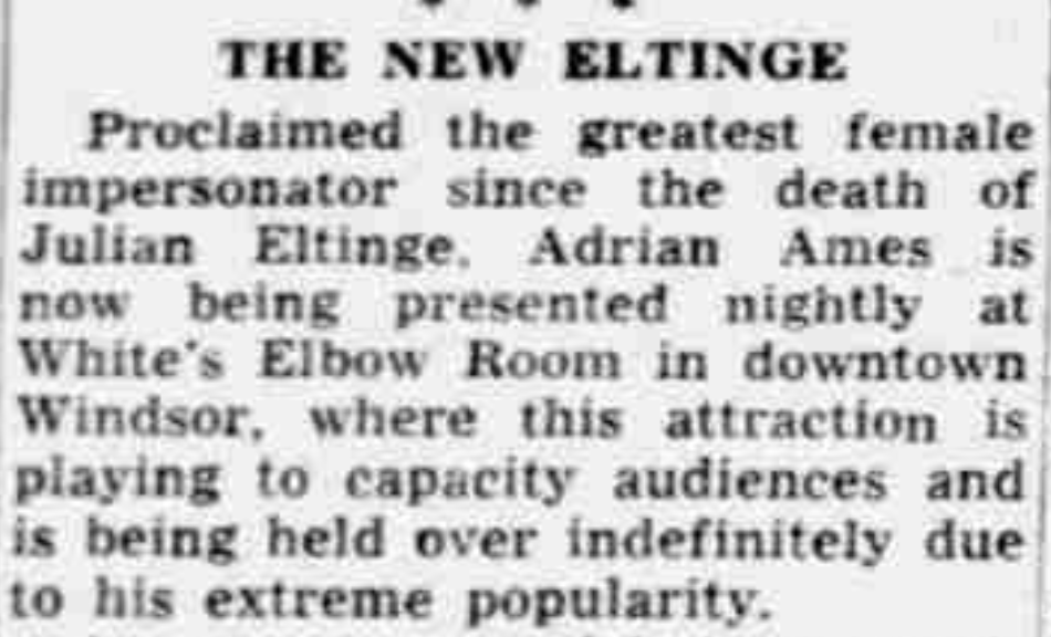 Discusses the career of Adrian Ames, a female impersonator, and compares her to Julian Eltinge, another popular female impersonator.