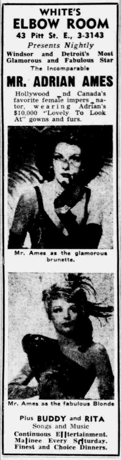 A newspaper advertisement showcasing Adrian Ames presenting at White's Elbow Room nightly in Windsor. The advertisement features two close-up images of Ames, one as a brunette and one as a blonde.