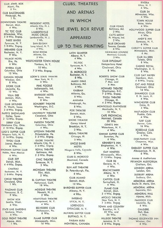 Clubs, Theatres, and Arenas in Which the Jewel Box Revue Appeared Up to This Printing