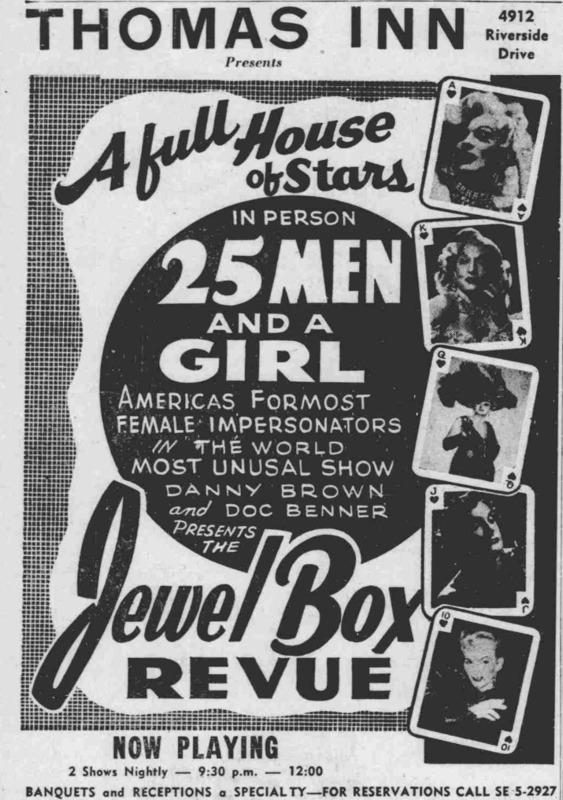 A Windsor Daily Star advertisement for Thomas Inn announcing Jewel Box Revue's two nightly shows. The ad features photos of many of the female impersonators in the group.