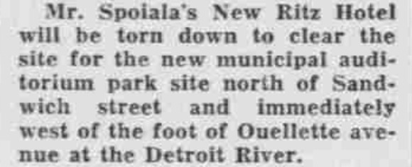 The New Ritz Hotel, a hotel with a popular bar, was torn down shortly after this article was published to make room for a new municipal auditorium. The hotel, owned by George Spoiala, would be re-opened at a new location.