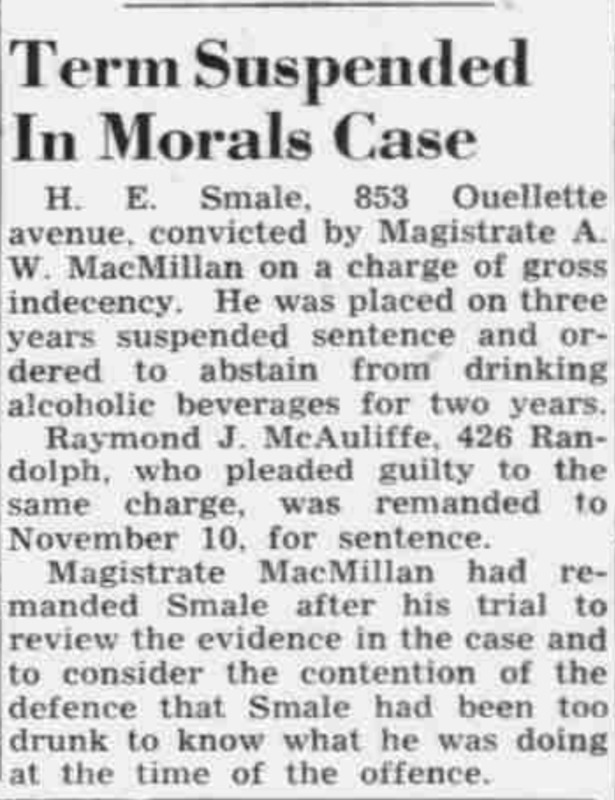 This article describes the outcome for one of two men convicted of gross indecency together in 1950. H.E. Smale would plead not guilty, arguing that his level of intoxication meant he did not know what he was doing. Raymond J. McAuliffe, however, would plead guilty, and be sentenced at a later date.