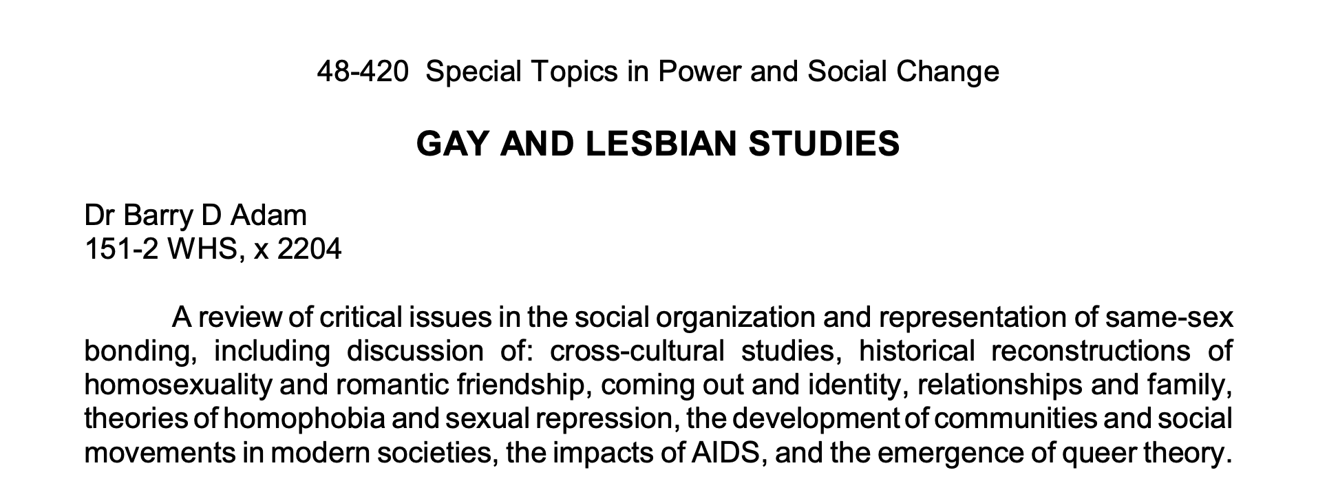The syllabus for the first course on Gay and Lesbian Studies at the University of Windsor. The course is labelled "48-420 Special Topics in Power and Social Change", going over the overview, required readings, and a week by week breakdown. It covers from the classical era to today, also discussing topics such as AIDS, relationships, psychology and psychiatry, and identity.