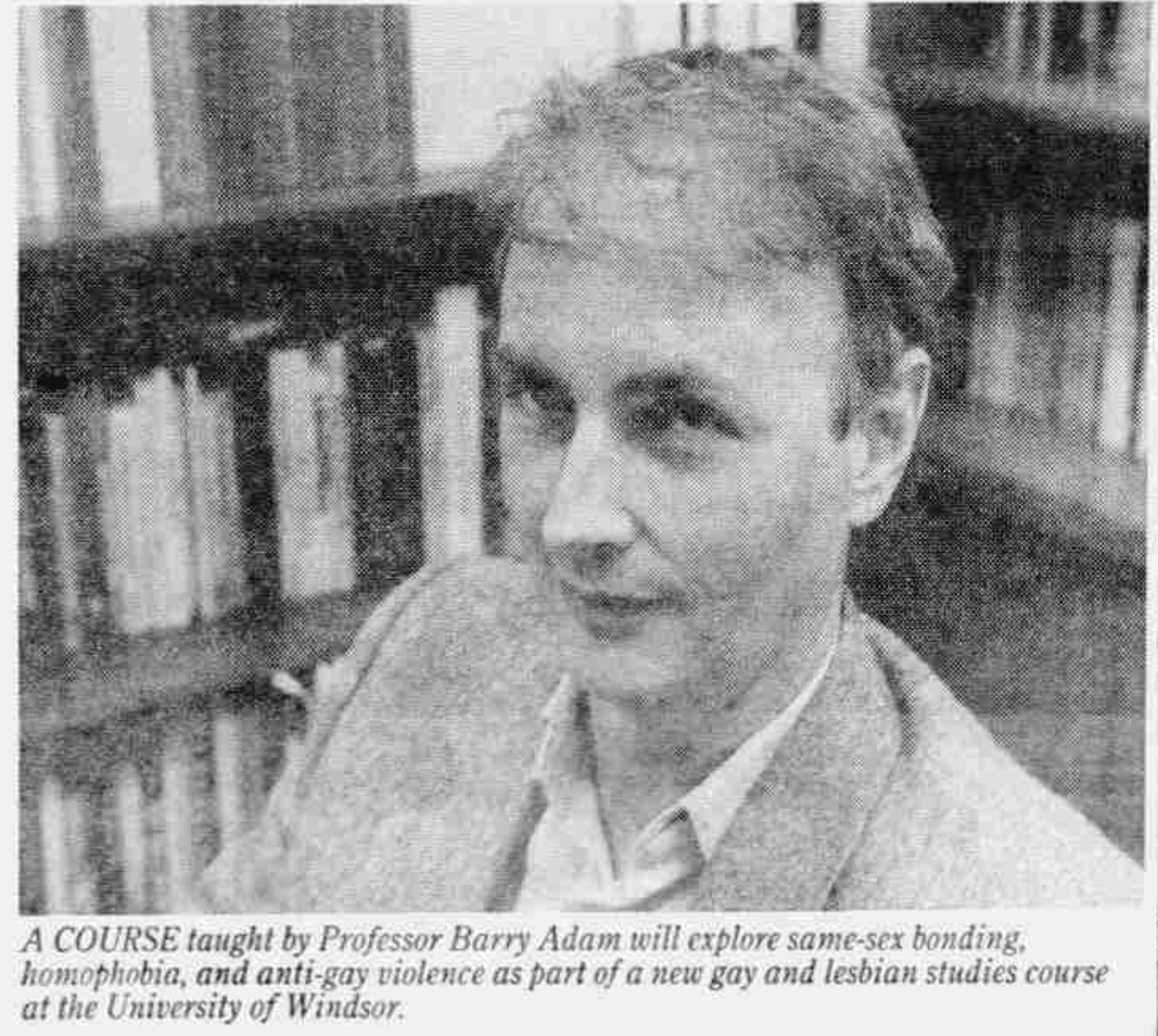 Discusses Barry Adam's course about gay and lesbian studies beginning in January, and is the first of its kind at the University of Winsdor. The article discusses the course material, and Adam's research.