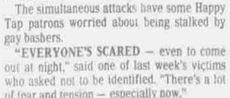 This article is about the attack and assault on August 21, along with another attack and robbery of two men that same day. The robbery occured when a gay couple left the bar, and then were beaten and robbed of their wallets and watches around 12:15 on Tuesday August 21. Many patrons of the Happy Tap are nervous now about being attacked. The OPP sergeant, Mike Kirk, does not think there is a connection between the two crimes.