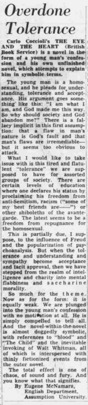 Eugene McNamara reviews Carlo Coccioli's "The Eye and the Heart" where the main character, a gay man, asks for understanding and tolerance. The man says that God made him this way, so why should society hate him? Eugene says that any flaw in man isn't God's fault but their own fault.