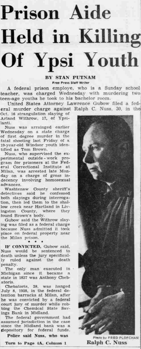 Ralph C. Nuss was charged with murdering two boys. He strangled Arland Withrow, 17, and shot Tom Brown, 19, of Windsor. He had been arrested also on a charge of gross indecency involving "homosexual advances" from his time supervising the outside-work program for a prison. He confessed to the murders.