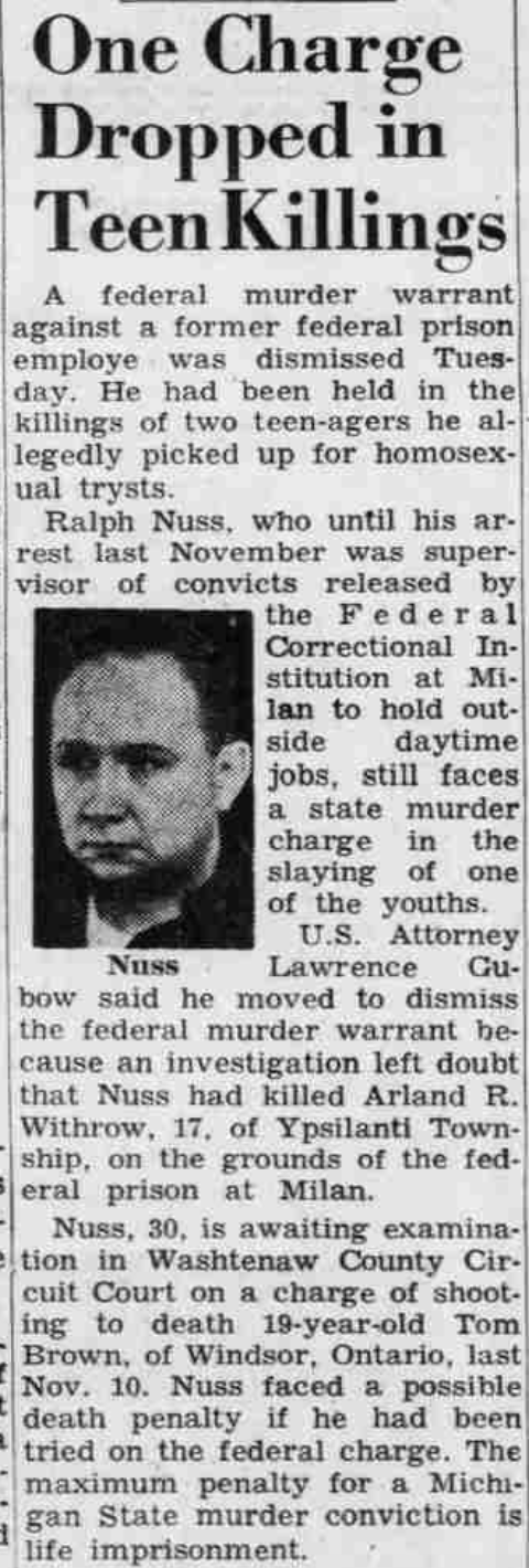 He was let off for the murder of Arland Withrow of Ypsilanti Township in Michigan, but the charges remained for the murder of Tom Brown of Windsor on November 10.