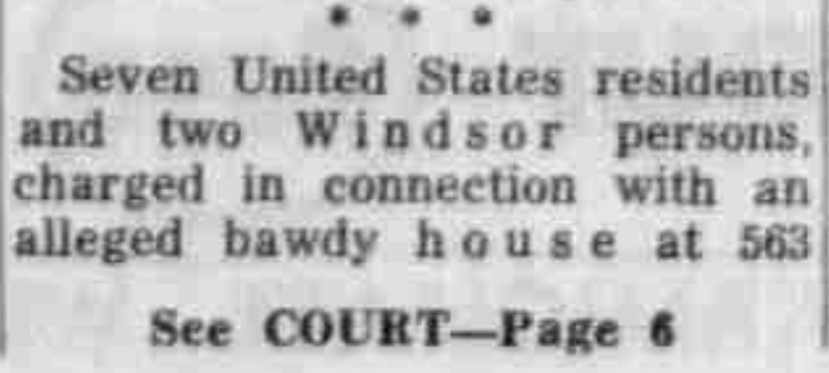 Seven American men and two Windsor people were charged in connection to an alleged bawdy house at 563 Brant Street. Joseph Cepaitis, the owner of the Etna Steam Baths was charged with keeping a bawdy house at that address.